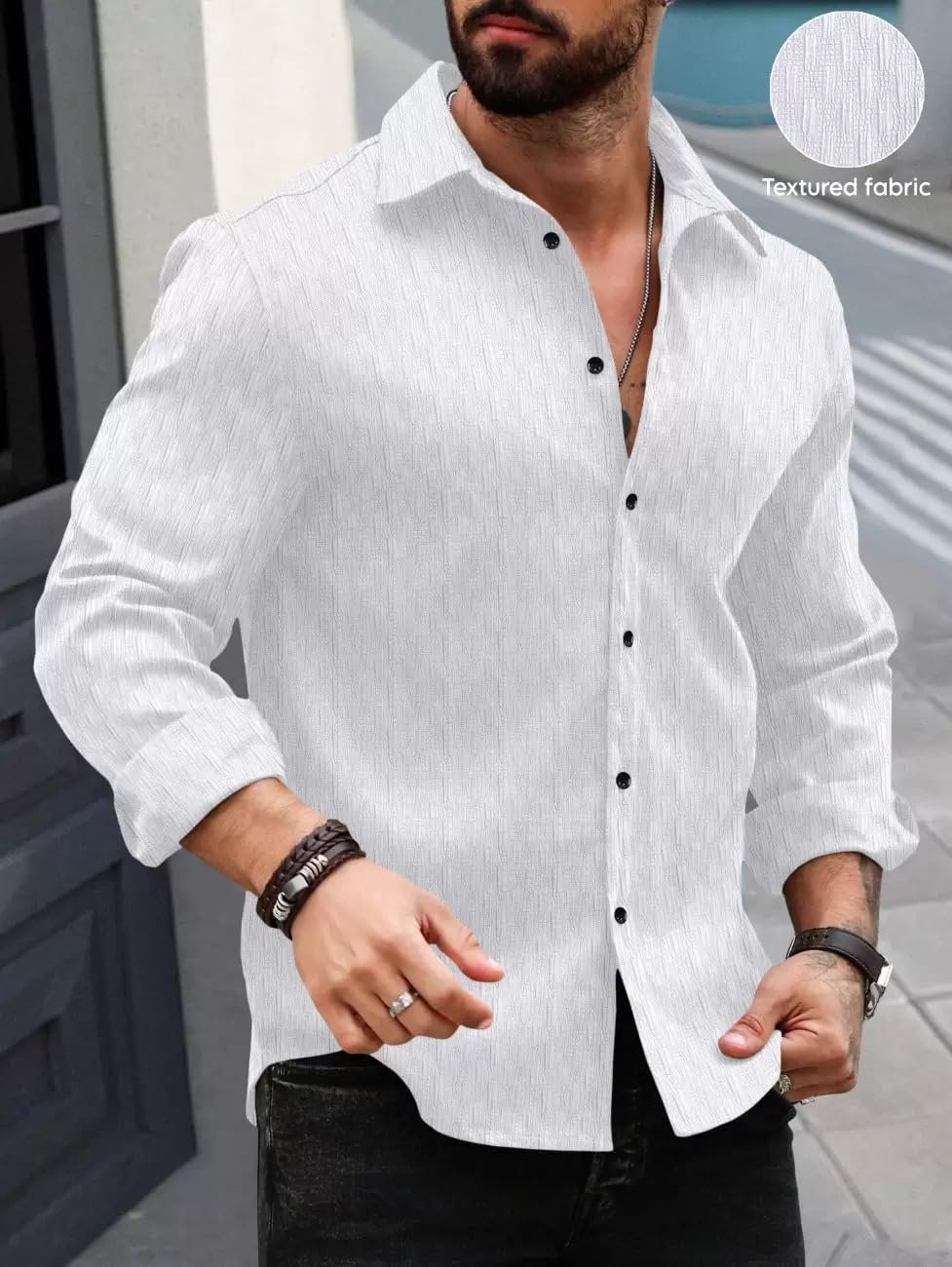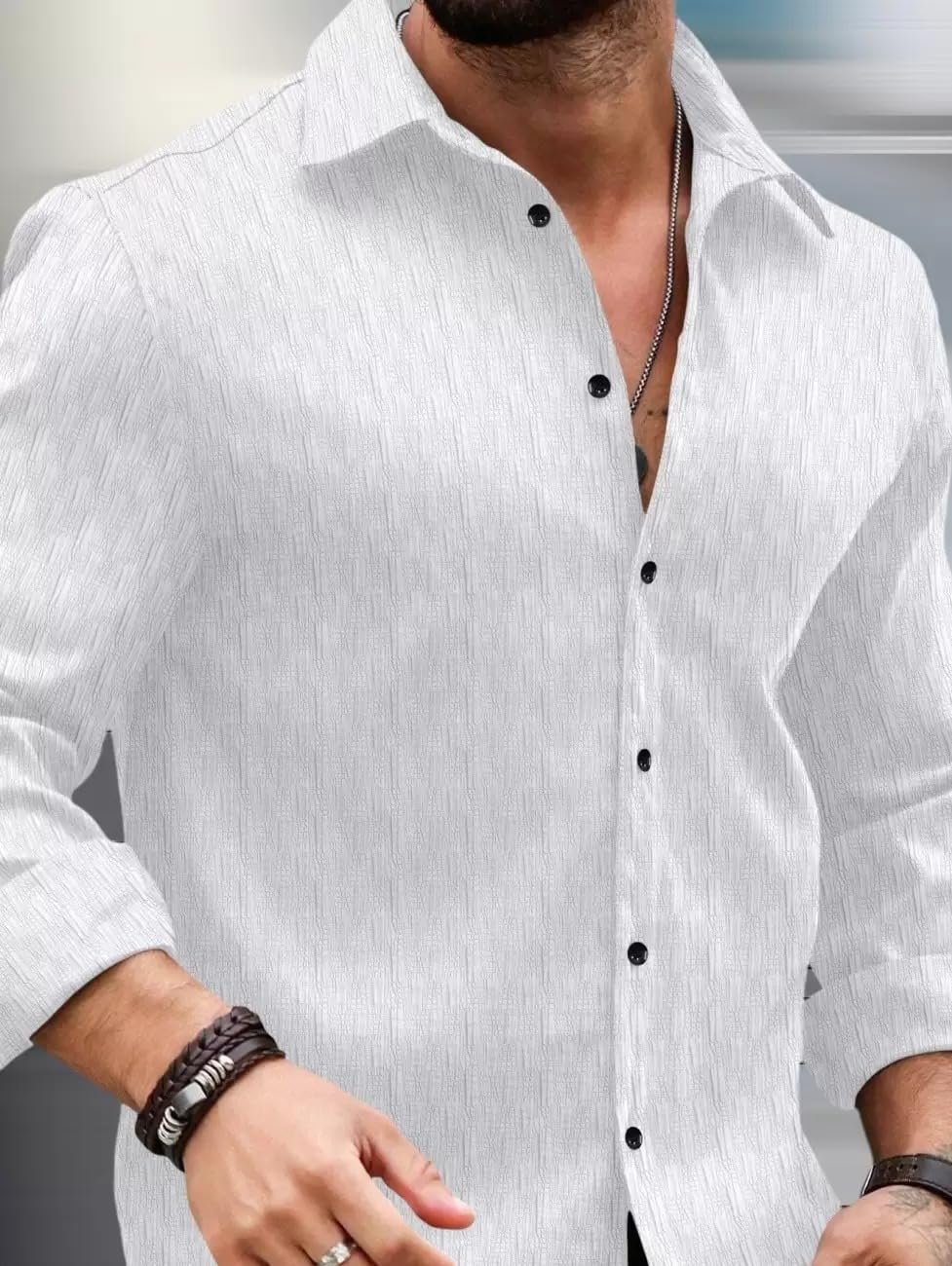 - { PATTERN } : Elegant Minimal Pattern Detailing || Solid Design For Men || FIT TYPE : Tailored Regular Fit Design || Comfortable Regular Fit || Relaxed Casual Fit || Smart Structured Fit for Sharp Look