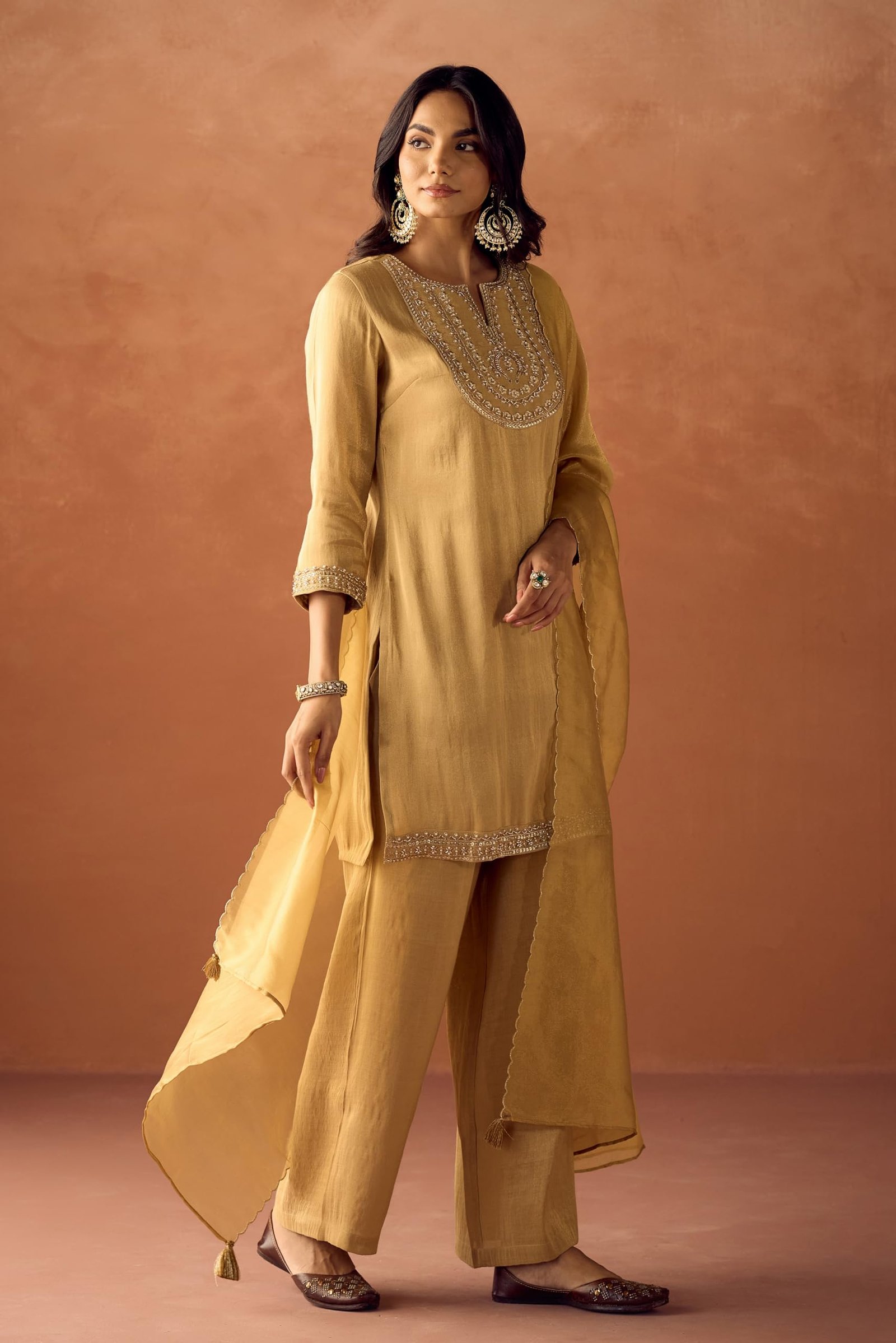 FIORRA Women Mustard Yellow Tissue Blend Hand Embroidered Kurta Set with Dupatta SET0241