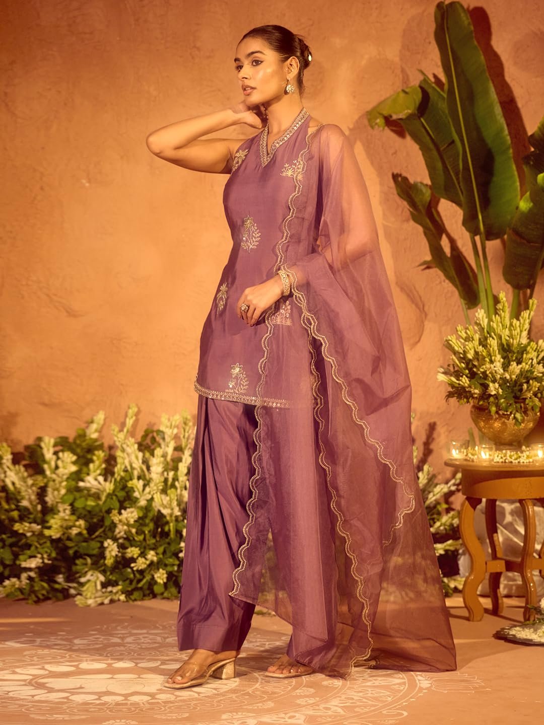 Step into elegance with this beautiful lavender straight kurta set from FIORRA. Crafted from luxurious viscose chanderi, the kurta features intricate golden embroidery on the front and hemline, highlighted with delicate sequin accents. The back is designed with a lace-up tie detail, adding a touch of contemporary charm. It is paired with matching wide-legged pyjamas for comfort and style, along with a sheer organza dupatta featuring scalloped embroidered edges. Perfect for festive celebrations, family gatherings, and wedding occasions, this ensemble beautifully balances tradition with modern elegance.