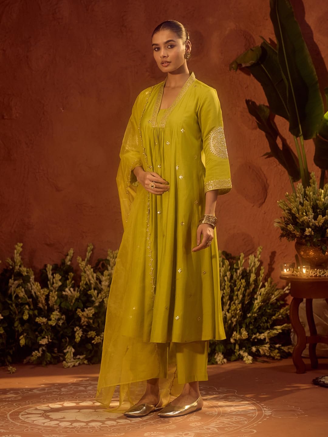 Brighten up your festive wardrobe with this elegant lime green A-line kurta set from FIORRA. Crafted from a flowy silk-blend fabric, the kurta features delicate embroidery and sequin highlights, along with a beautifully designed V-neckline and flared silhouette. The set comes with matching straight pants for comfort and a sheer organza dupatta detailed with embroidered motifs and scalloped border. Perfect for festive gatherings, weddings, and celebrations, this set blends tradition with a modern touch.