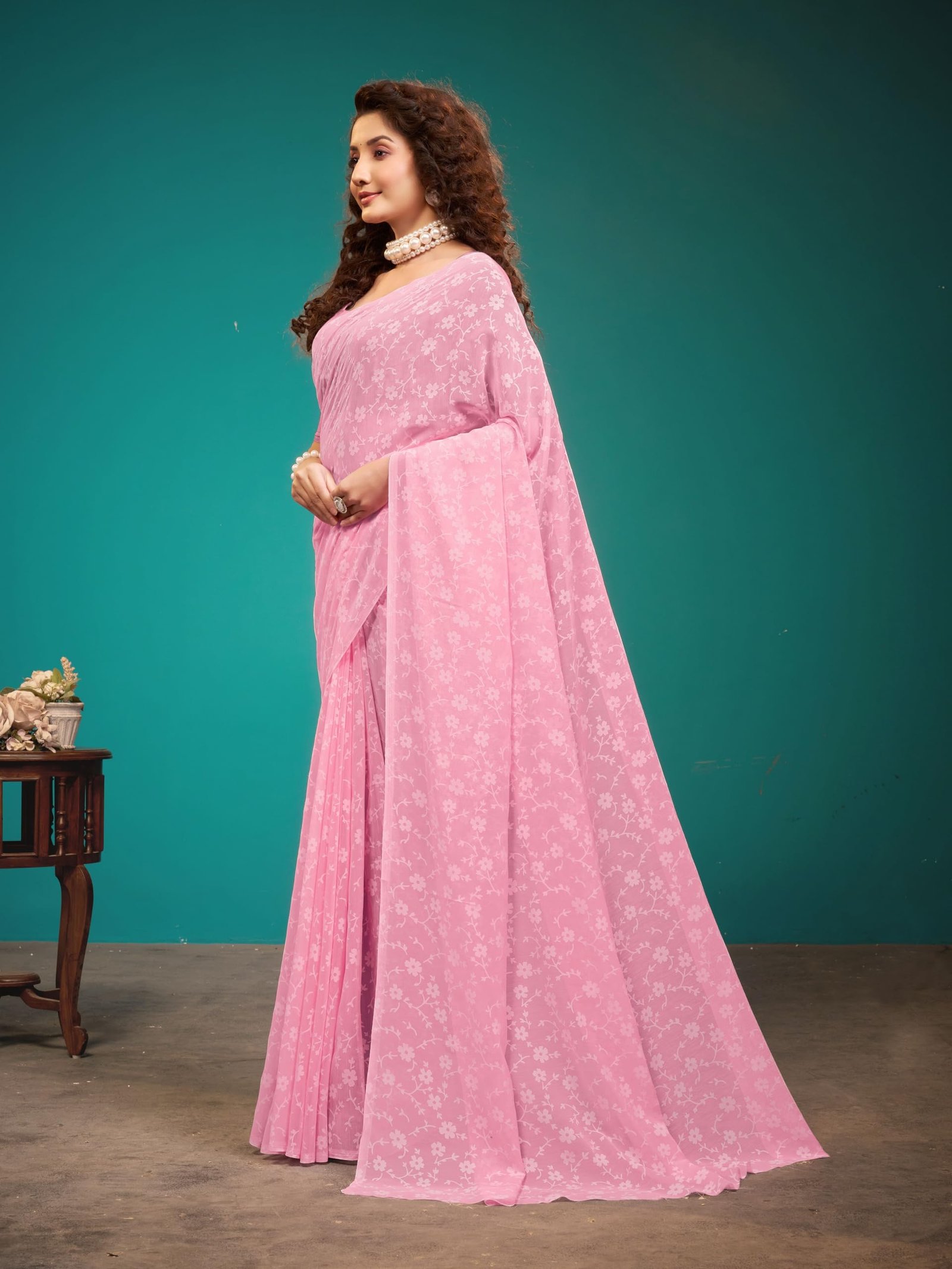 Garden Vareli Women Viscose Brasso Floral Print Saree – Pink