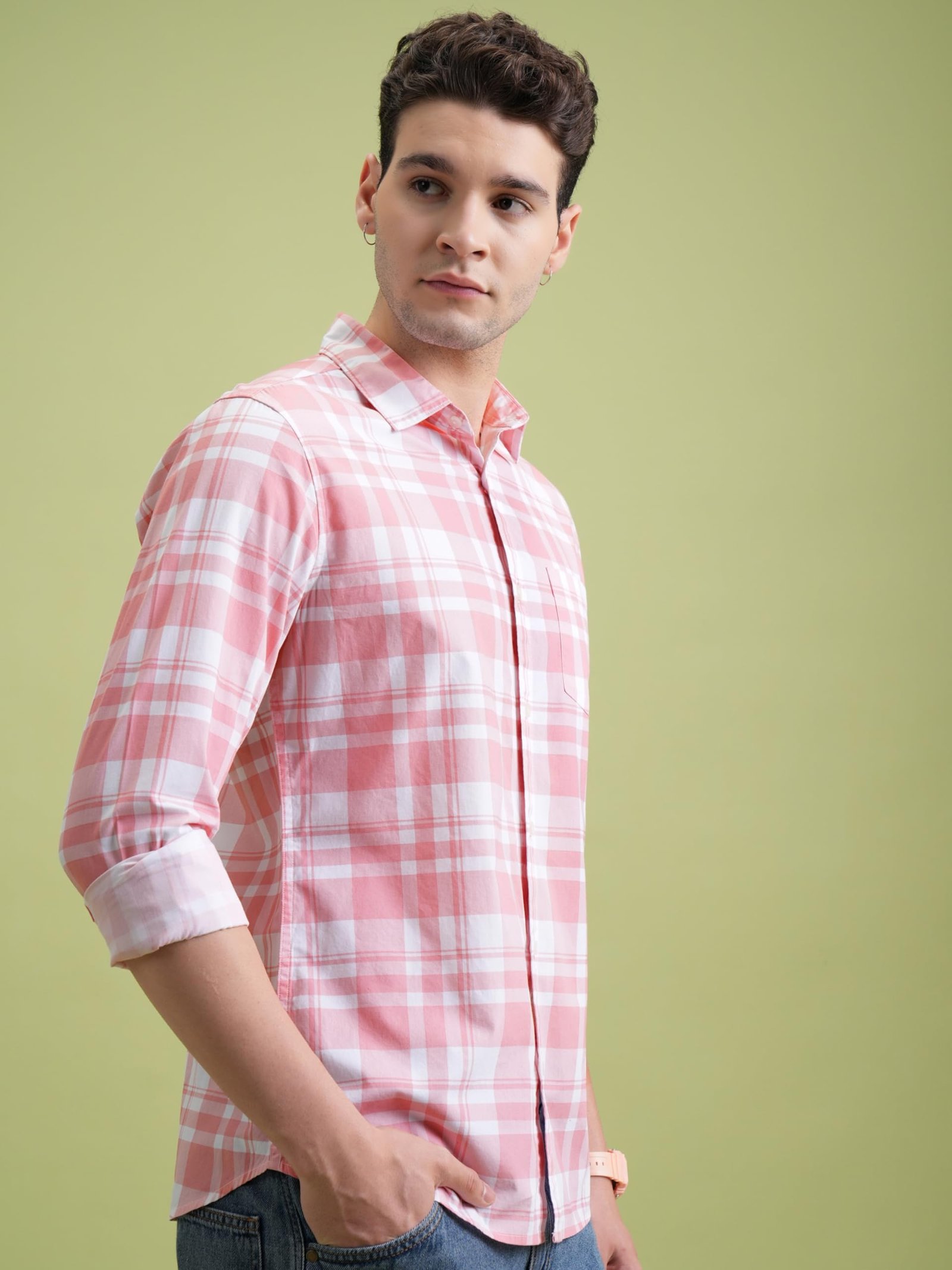 Highlander Men Cotton Slim Fit Shirt (PHSH000014_LT Pink/White L)