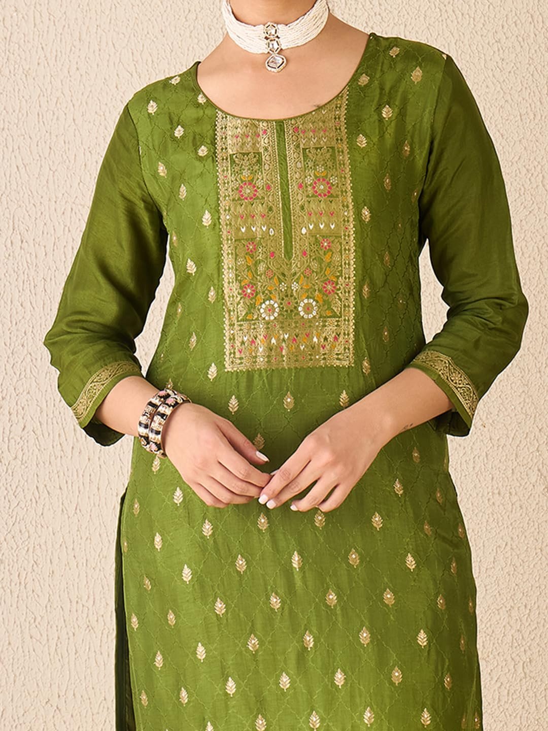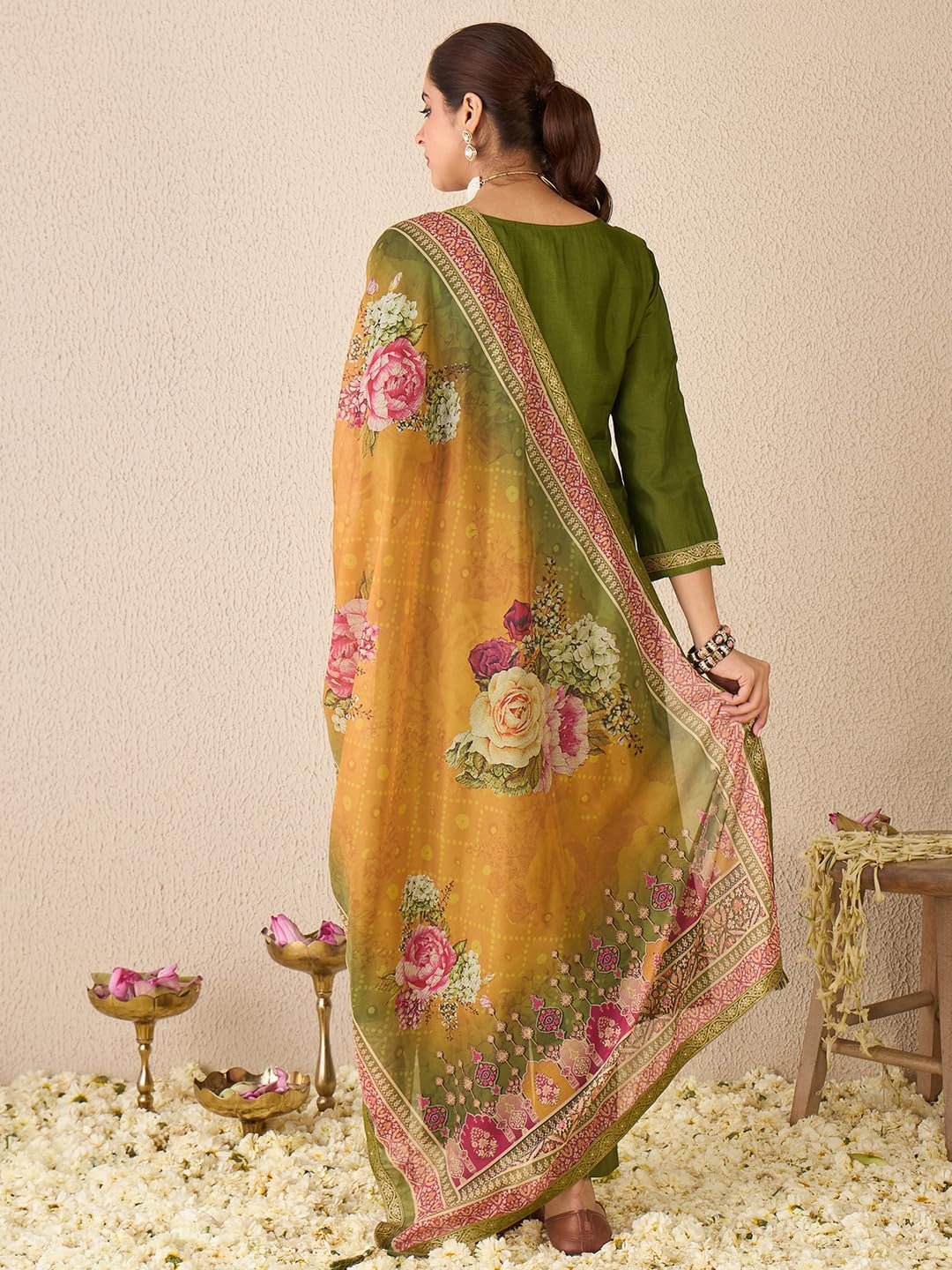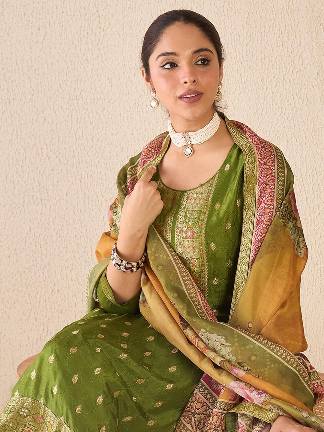 - Color : Green || Top Fabric : Silk Blend || Bottom Fabric : Shantoon || Dupatta Fabric : Organza