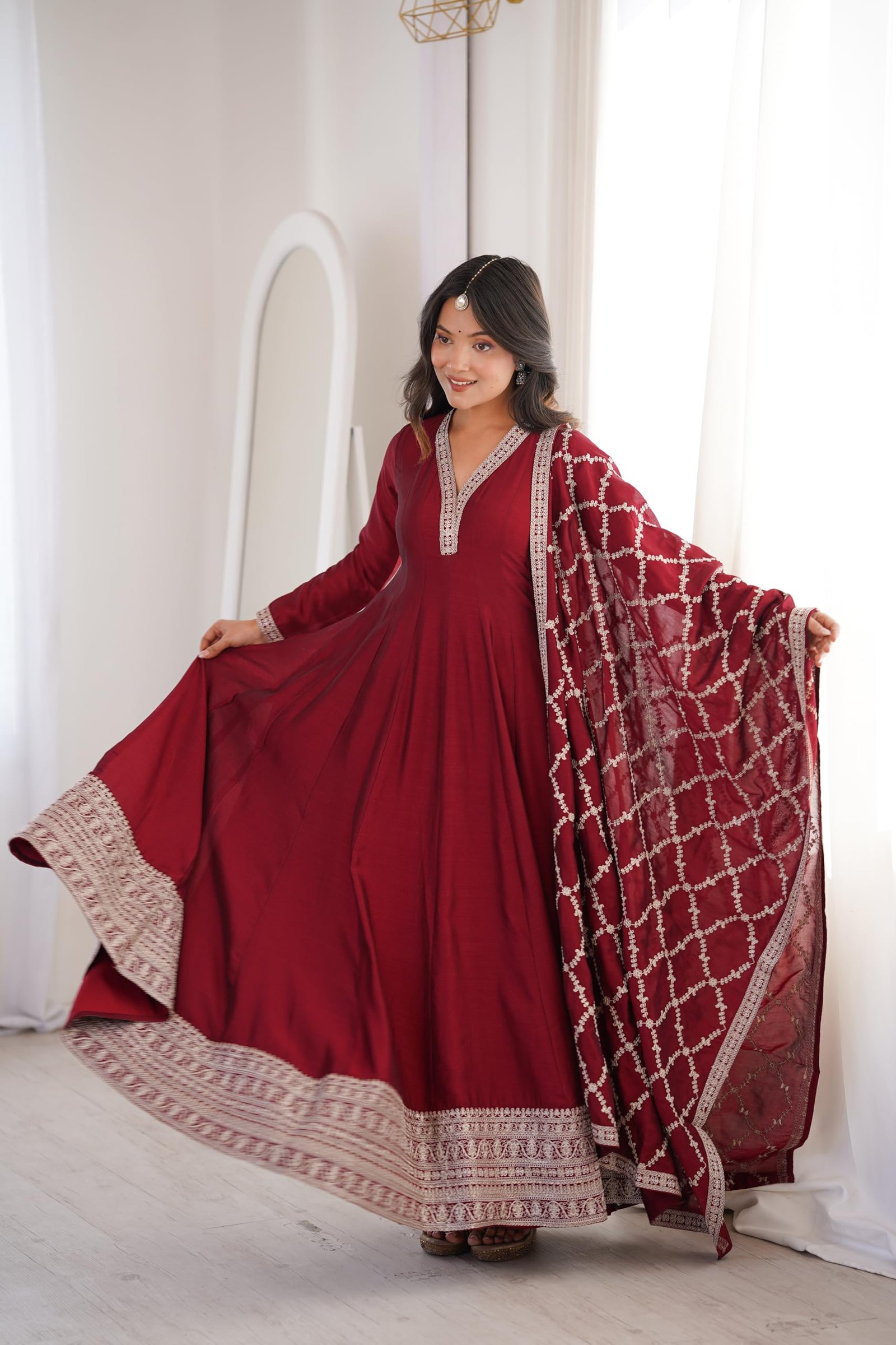 Kryvyn Women Anarkali Kurta with Dupatta, Embroidered Flared Ethnic Gown Style, Festive Wedding Dress (in, Alpha, XS, Regular, Maroon)