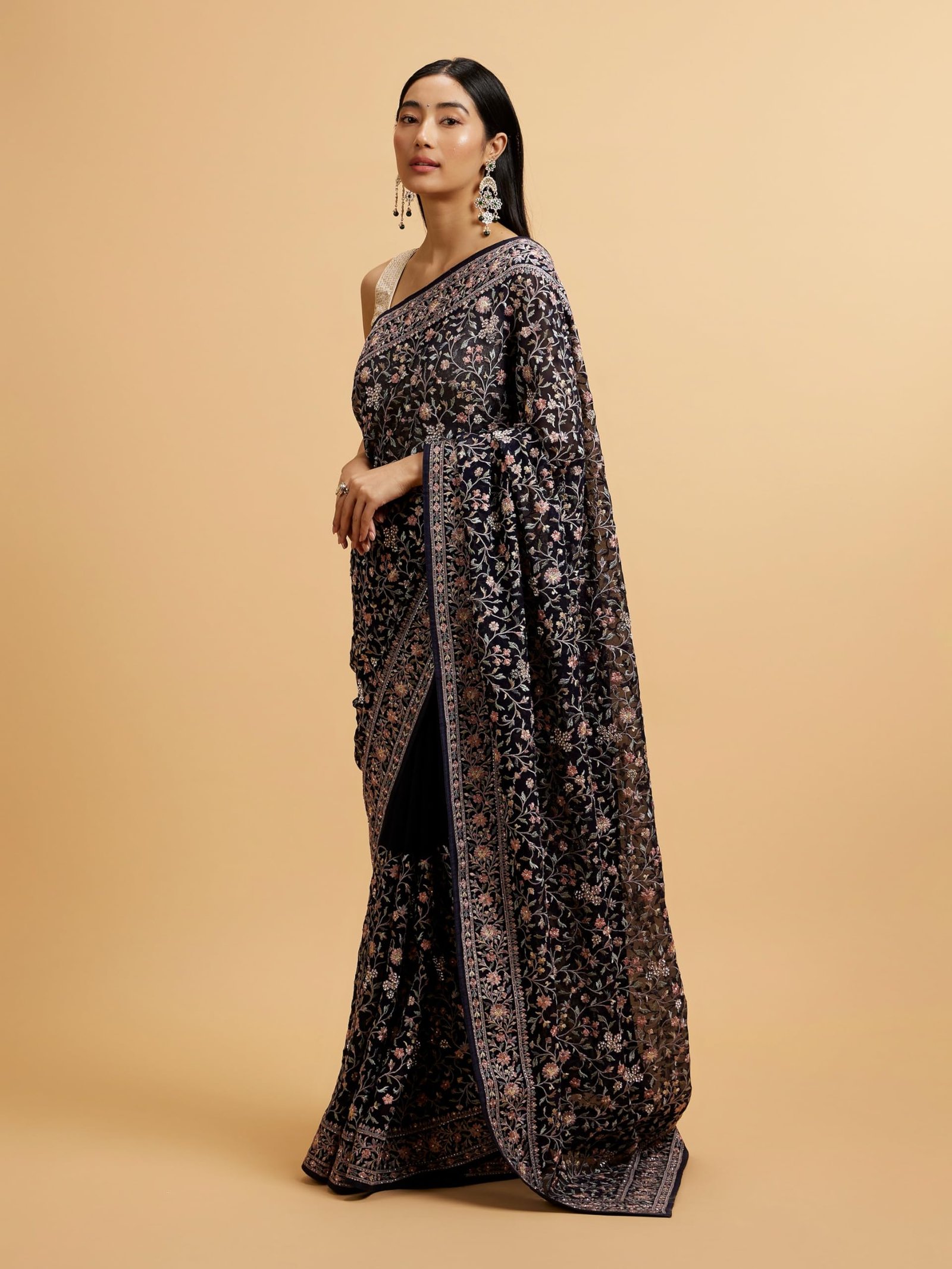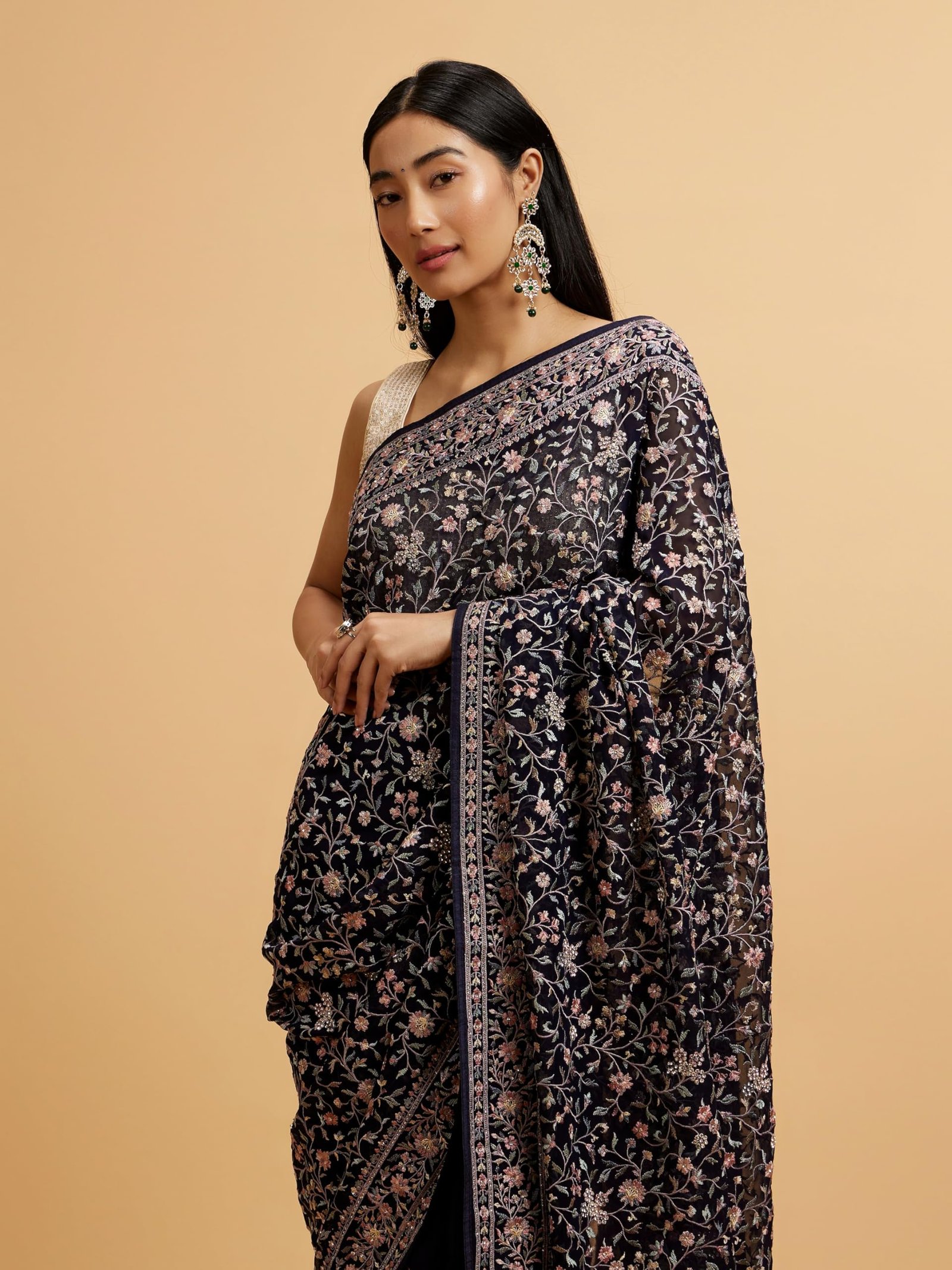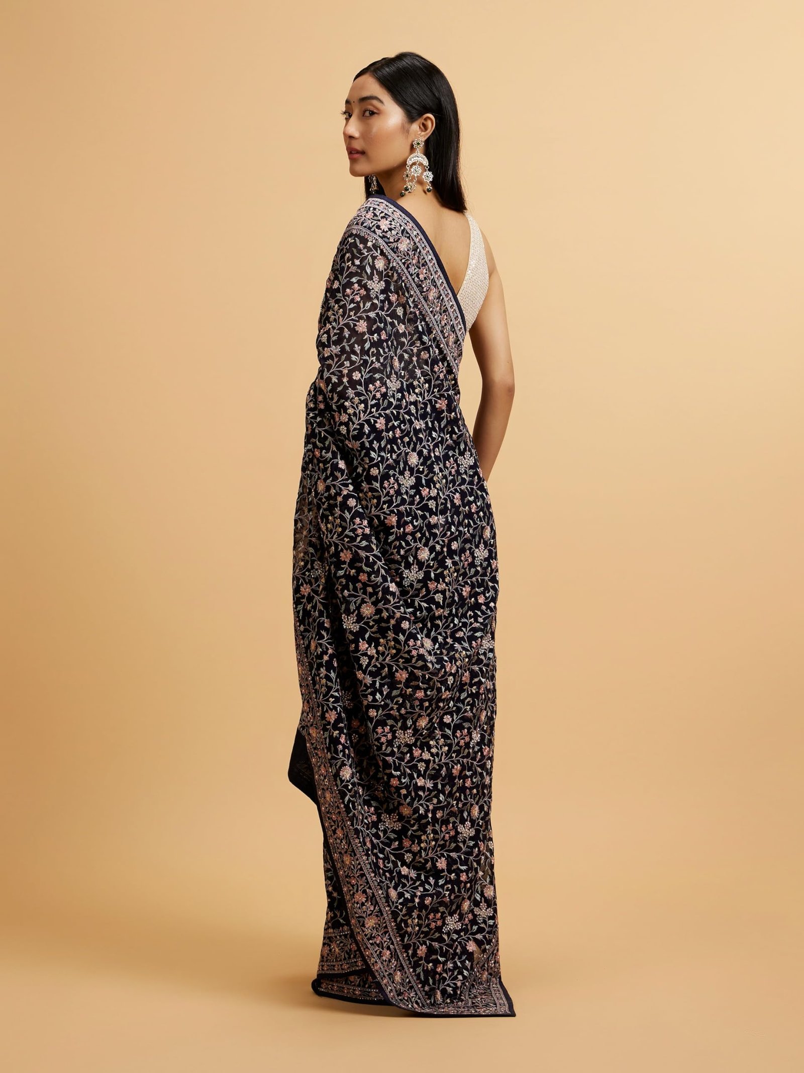 - Design: Drape yourself in timeless elegance with our indigo blue saree adorned with exquisite bel buti embroidery. This masterpiece showcases intricate floral and vine motifs delicately stitched across the rich, deep blue fabric, making it perfect for both festive and formal events. Style it with pearl jewellery and complementing heels for a complete look.
