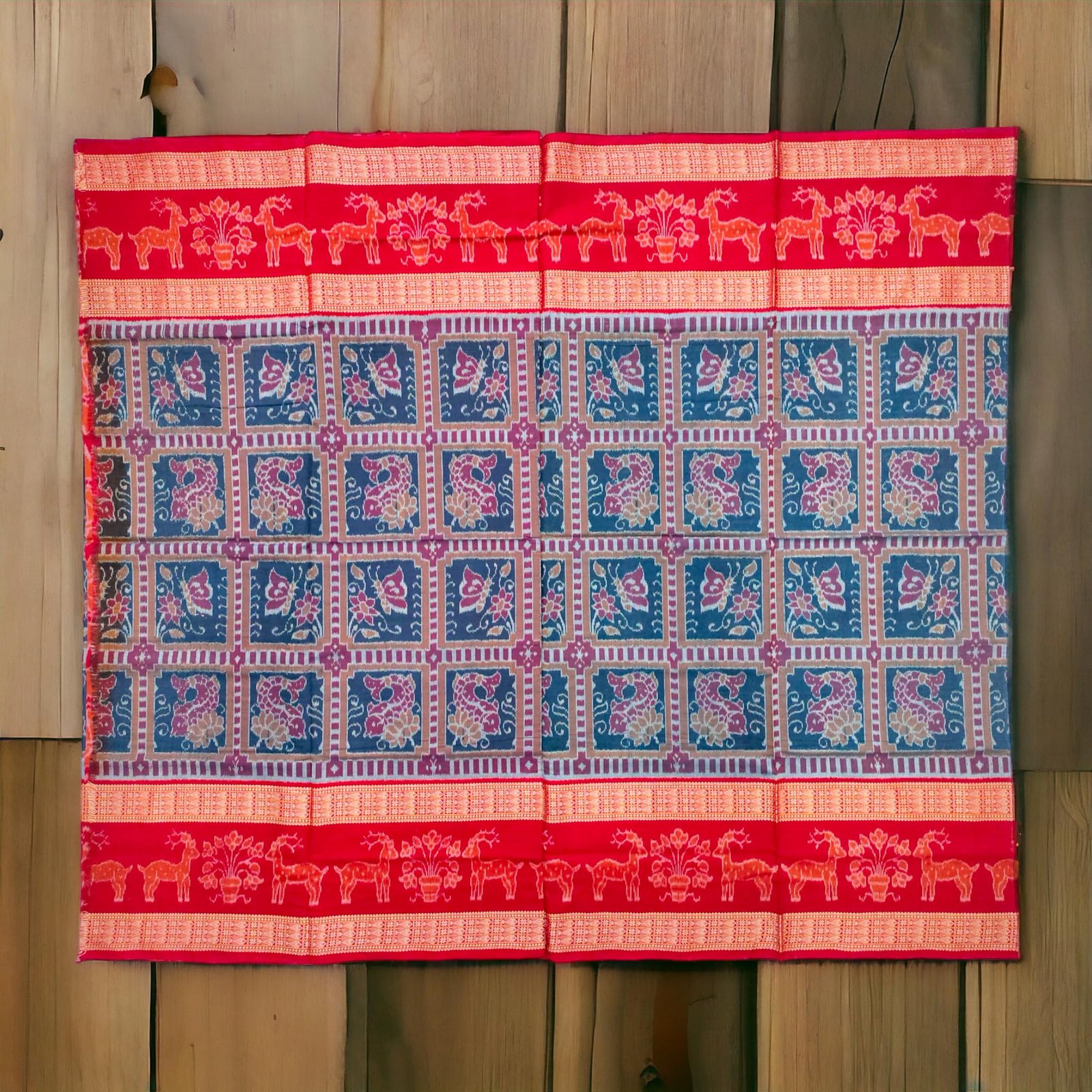- Bandha Weave Craftsmanship: Utilizing the traditional Bandha weave technique, this saree is handwoven with precision, showcasing intricate double fish motifs border and delicate butterfly motifs throughout the fabric.