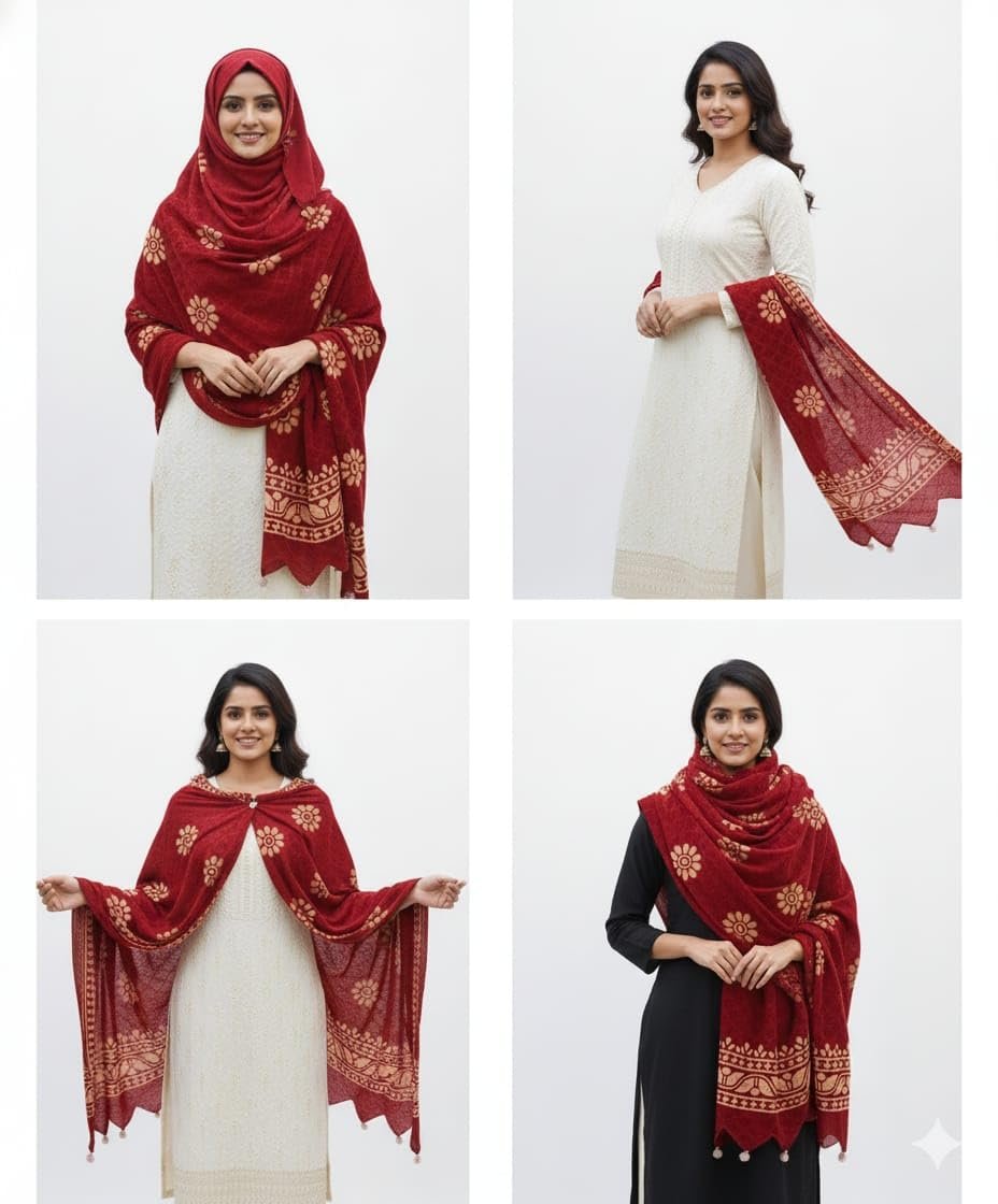 - “Crimson Heritage Handwoven Dupatta Featuring Intricate Golden Floral Motifs and Ethnic Border Design”