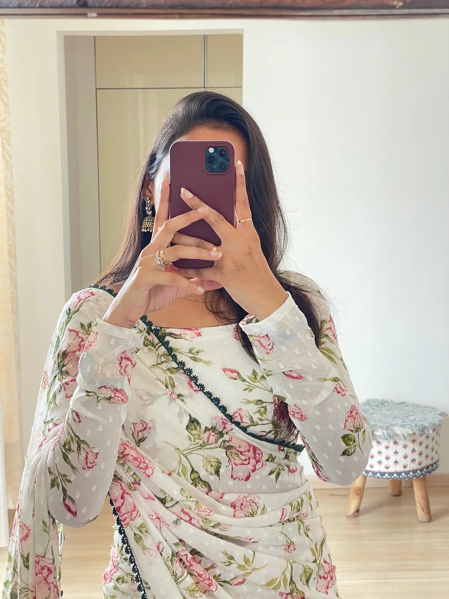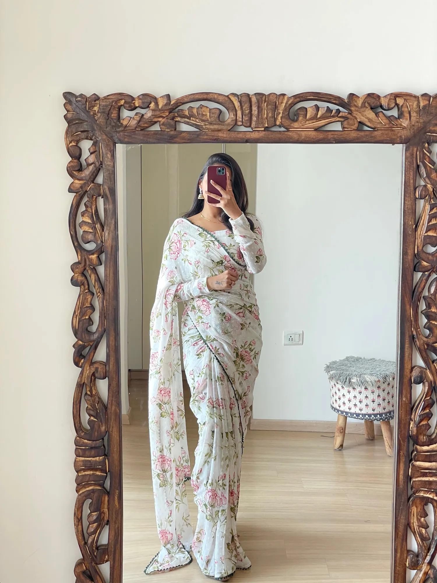 Sidhidata Women’s Georgette Printed Ready To Wear one Minute Saree With Unstitched Blouse Piece (1000 Butty White_White_Free Size)