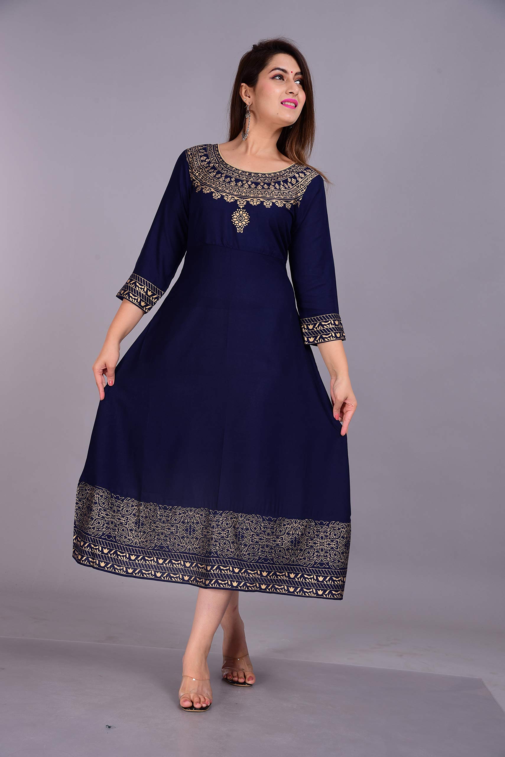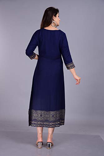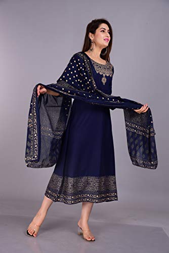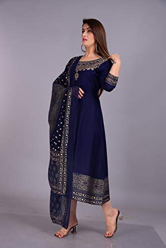 Skya Sia Women’s Rayon Solid Gold Print Kurta and Dupatta Set (Navy Blue-L)