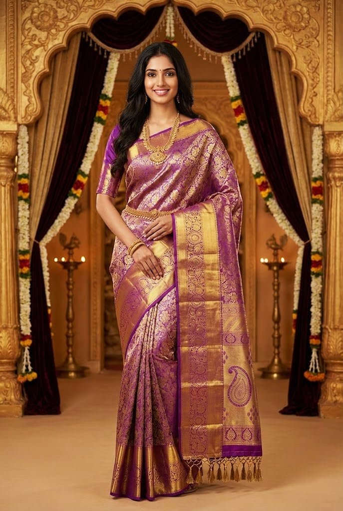 - Authentic Kanchipuram Silk: Experience the luxurious feel of pure Kanchipuram silk sarees, handwoven with intricate zari work.