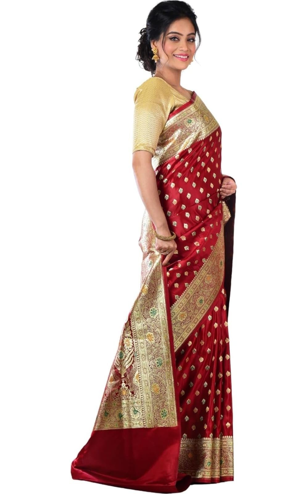 • MATERIAL: Pure Silk Banarasi saree crafted with intricate traditional weaving techniques for luxurious appeal