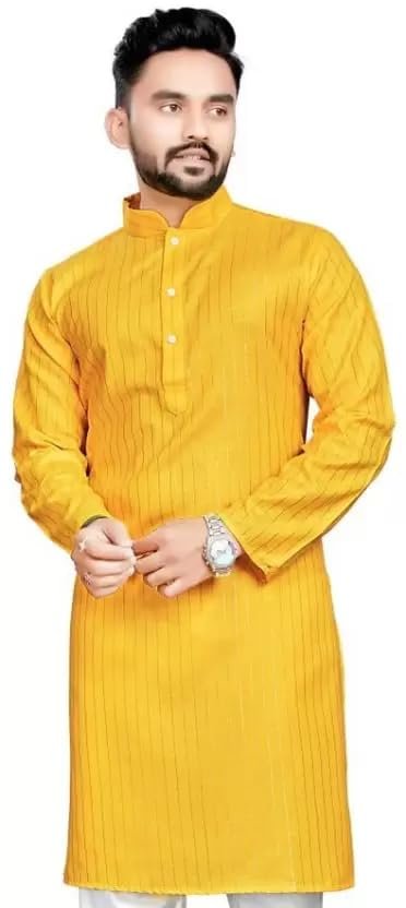 weltpocket Men’s Cotton Blend Straight Zari Lining Kurta (34, Yellow)