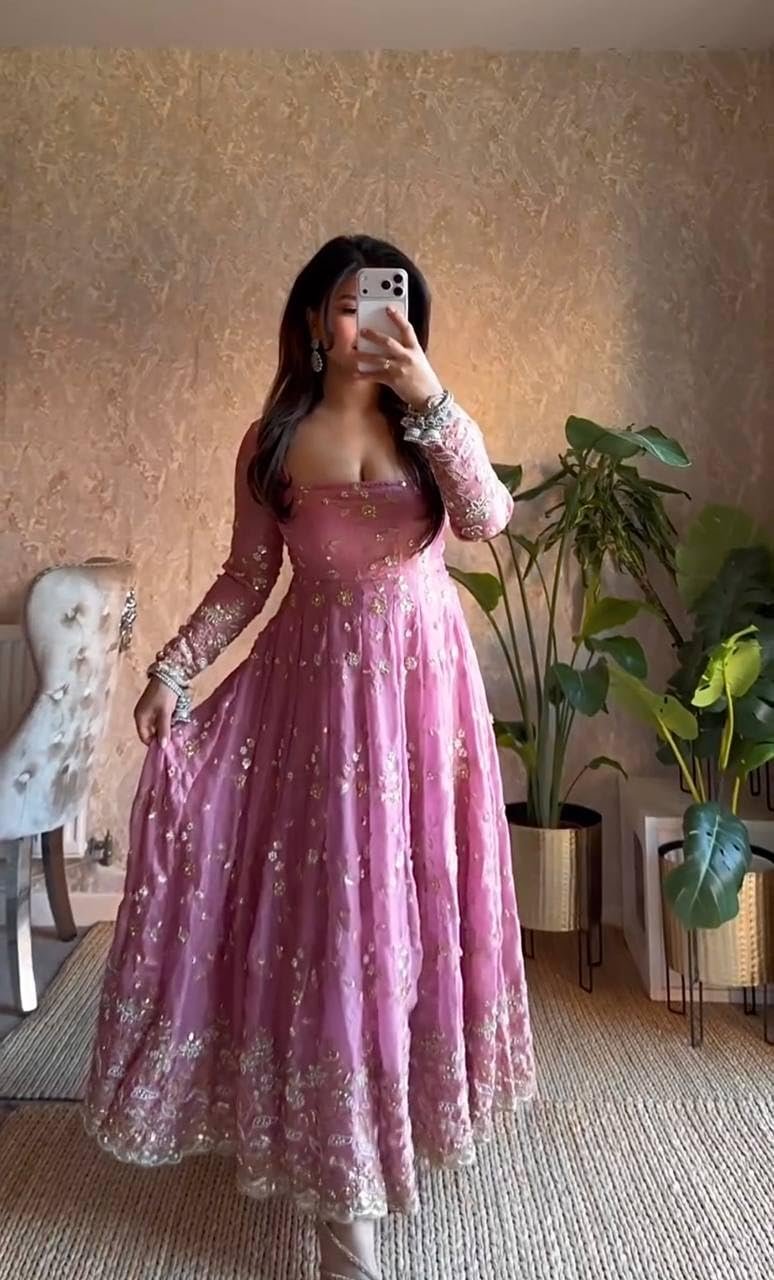Elevate your ethnic wardrobe with this stunning Anarkali gown crafted from flowing fabric. The gown features exquisite sequin embroidery work that adds sparkle and glamour to your special occasions. The traditional Anarkali silhouette creates a graceful, flared profile that flatters various body types. This ensemble comes complete with a matching dupatta that adds an extra layer of elegance. The lightweight Georgette material ensures comfort during extended wear, making it perfect for weddings, festivals, and formal celebrations. The intricate sequin detailing catches light beautifully, making you stand out in any gathering. The classic off-white colour serves as a versatile choice that can be accessorised in multiple ways. This gorgeous Anarkali gown combines traditional aesthetics with contemporary design elements, making it a must-have addition to your festive wardrobe.